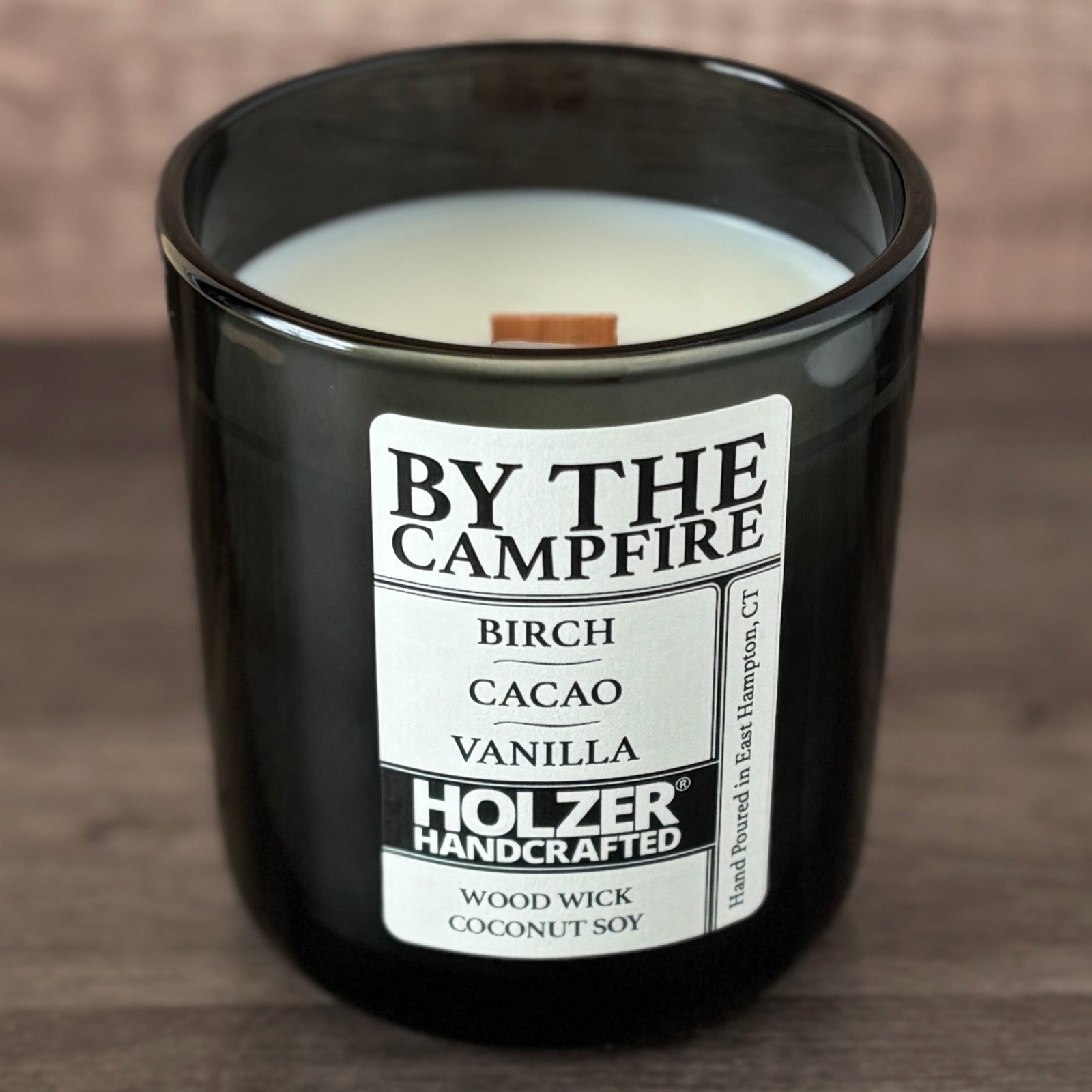 By The Campfire - Birch + Cacao + Vanilla Scented Wood Wick Candle, Luxury Glass Vessel with Lid