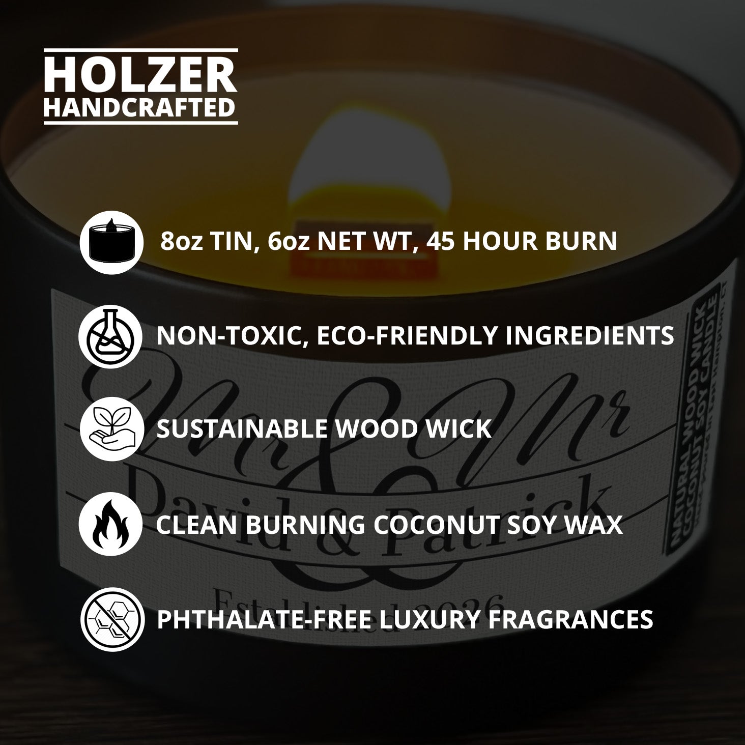 More About Personalized Wood Wick Candle - Custom Mr & Mr Wedding Keepsake, Coconut Soy Wax, 6oz