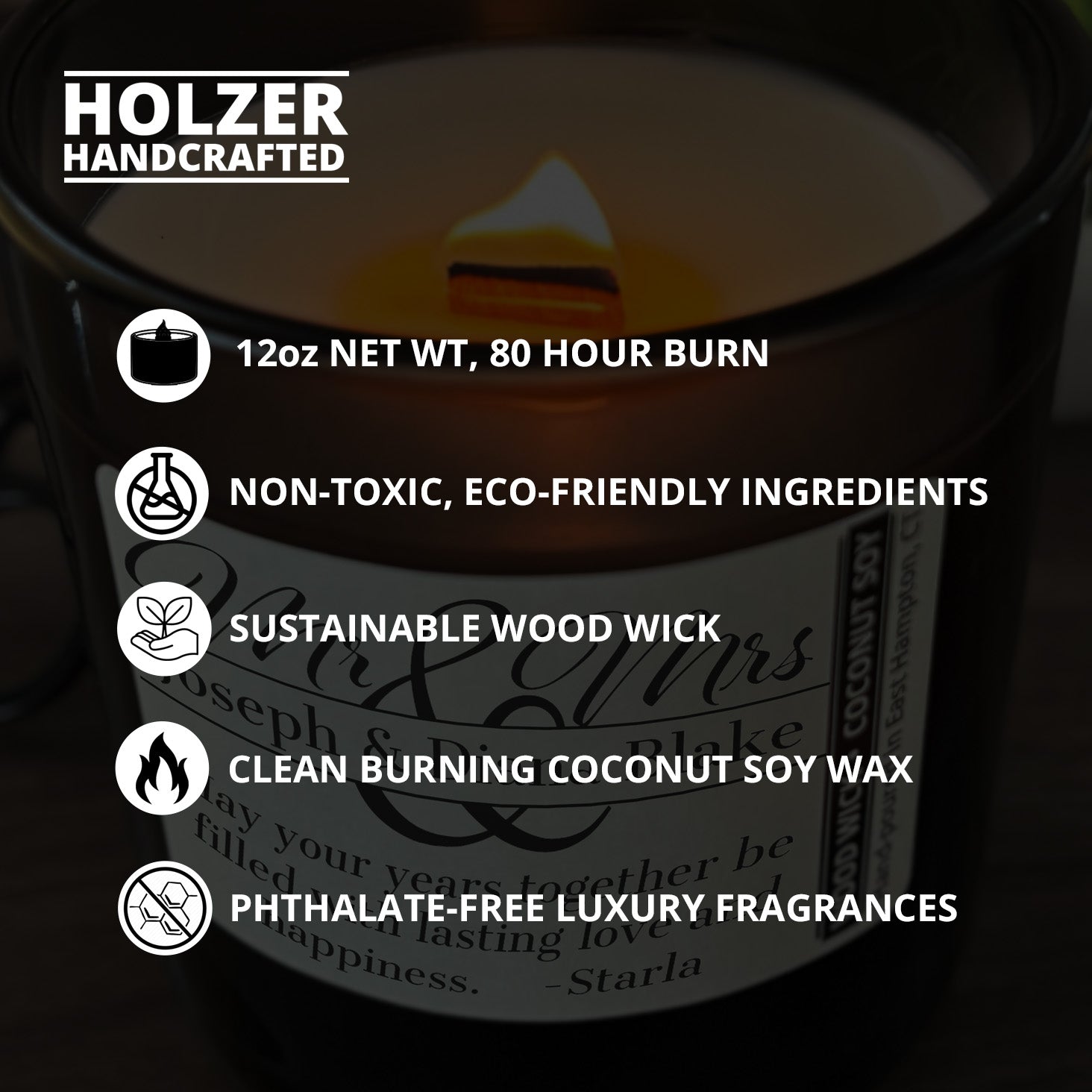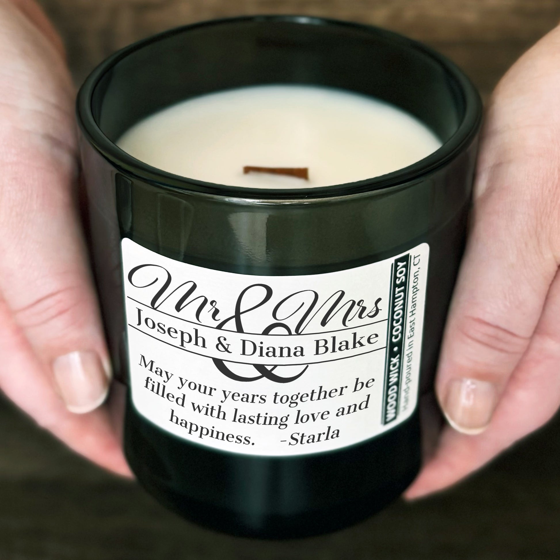 Personalized Wood Wick Candle - Custom Mr & Mrs Wedding Keepsake - 12oz Glass Vessel with Lid