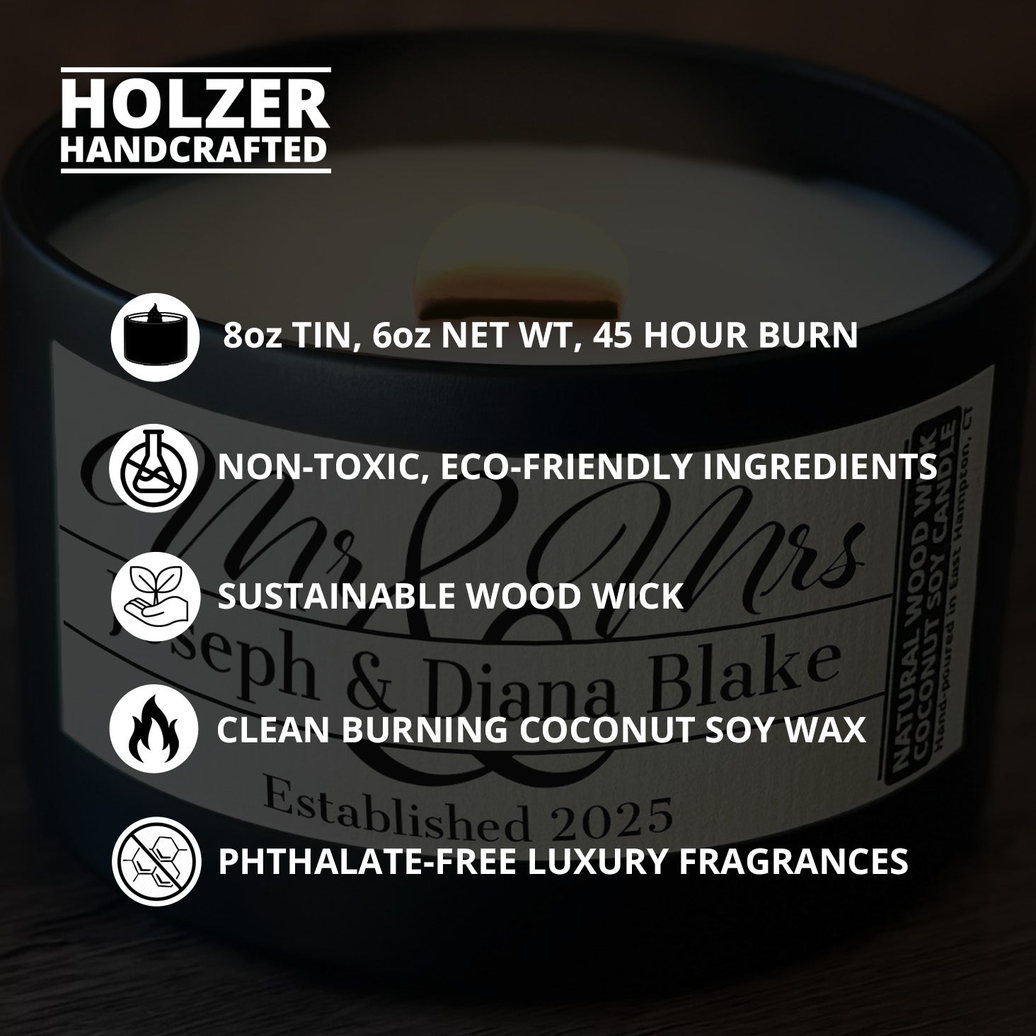 Personalized Wood Wick Candle - Custom Mr & Mrs Wedding Keepsake, Coconut Soy Wax, 6oz