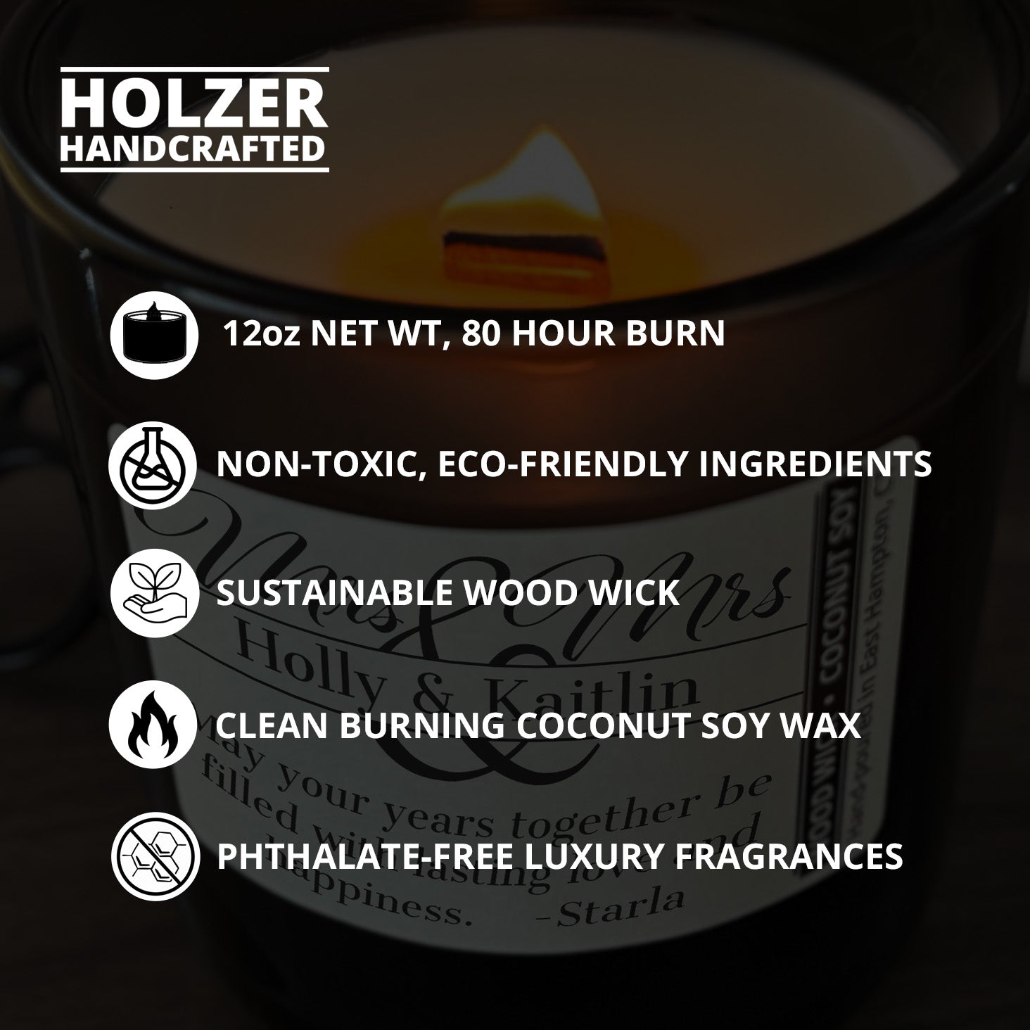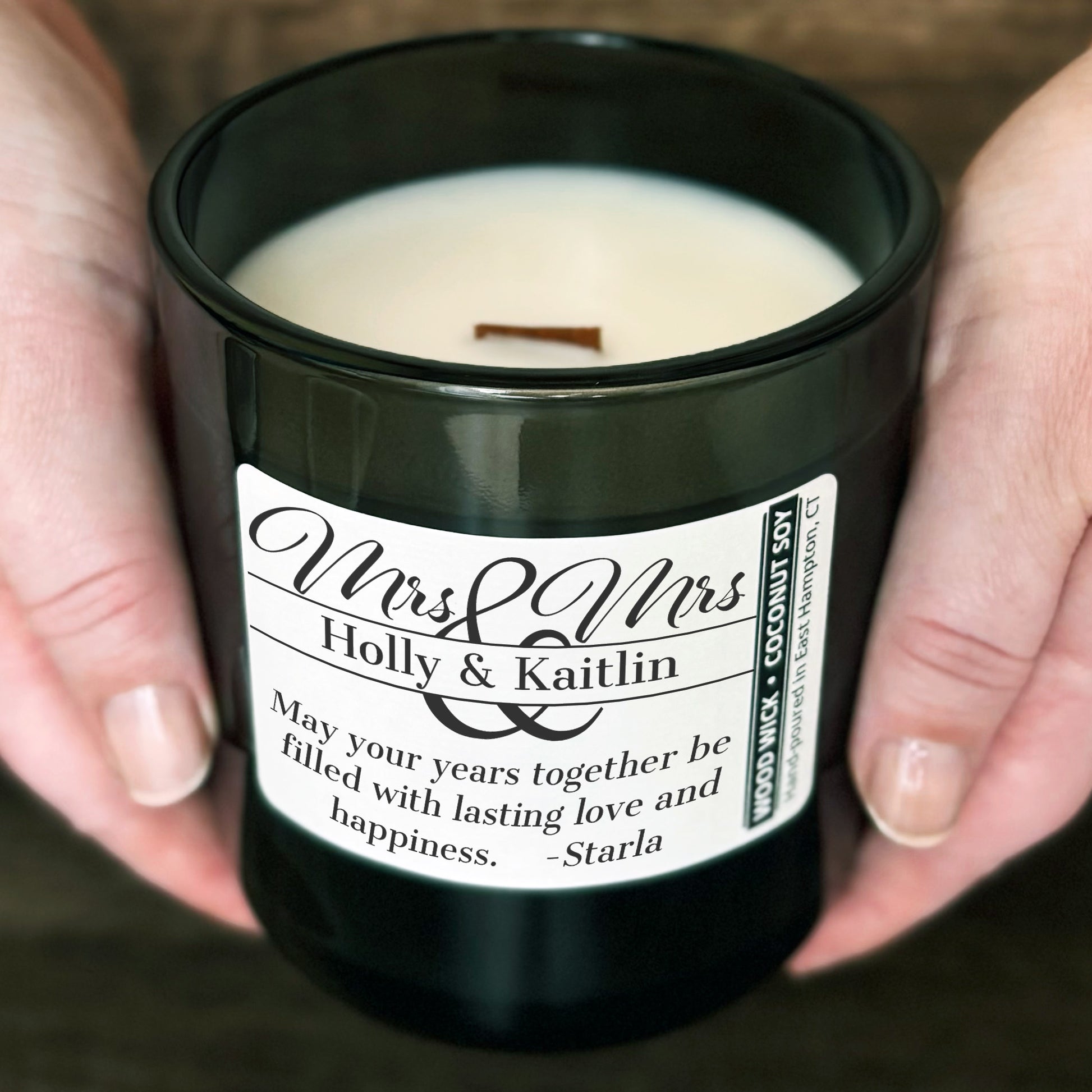 More About Personalized Wood Wick Candle - Custom Mrs & Mrs Wedding Keepsake - 12oz Glass Vessel with Lid