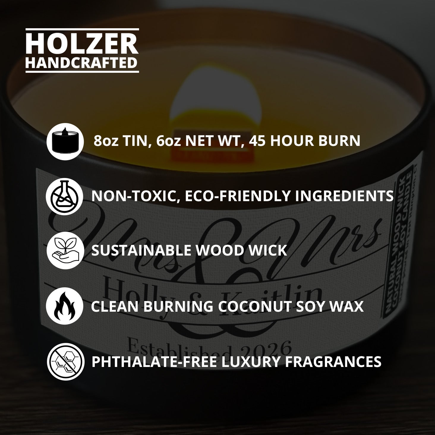 More About Personalized Wood Wick Candle - Custom Mrs & Mrs Wedding Keepsake, Coconut Soy Wax, 6oz