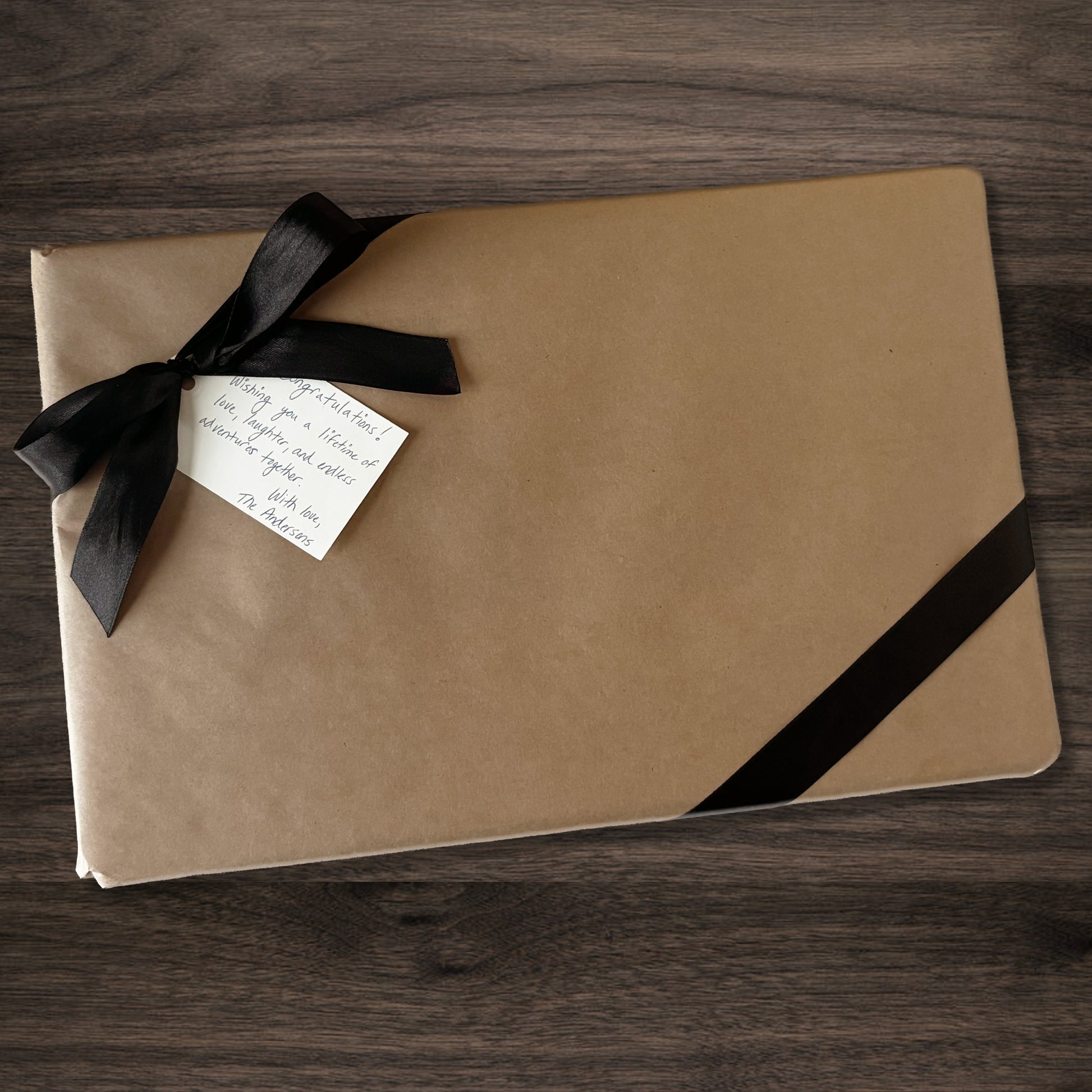 Turn your personalized cutting board into a ready-to-give moment, with heavy-duty butcher paper gift wrap and a handwritten gift tag, finished with a satin black ribbon.
