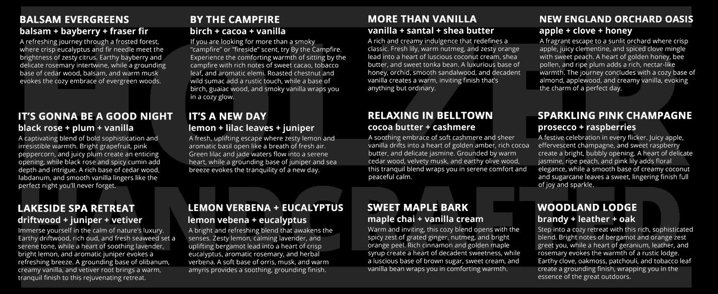 We use only premium fragrance oils formulated specifically for candles that meet the highest safety and quality standards. Every scent is phthalate-free, toxin-free, paraben-free, cruelty-free and vegan — for a luxurious experience you can feel good about.