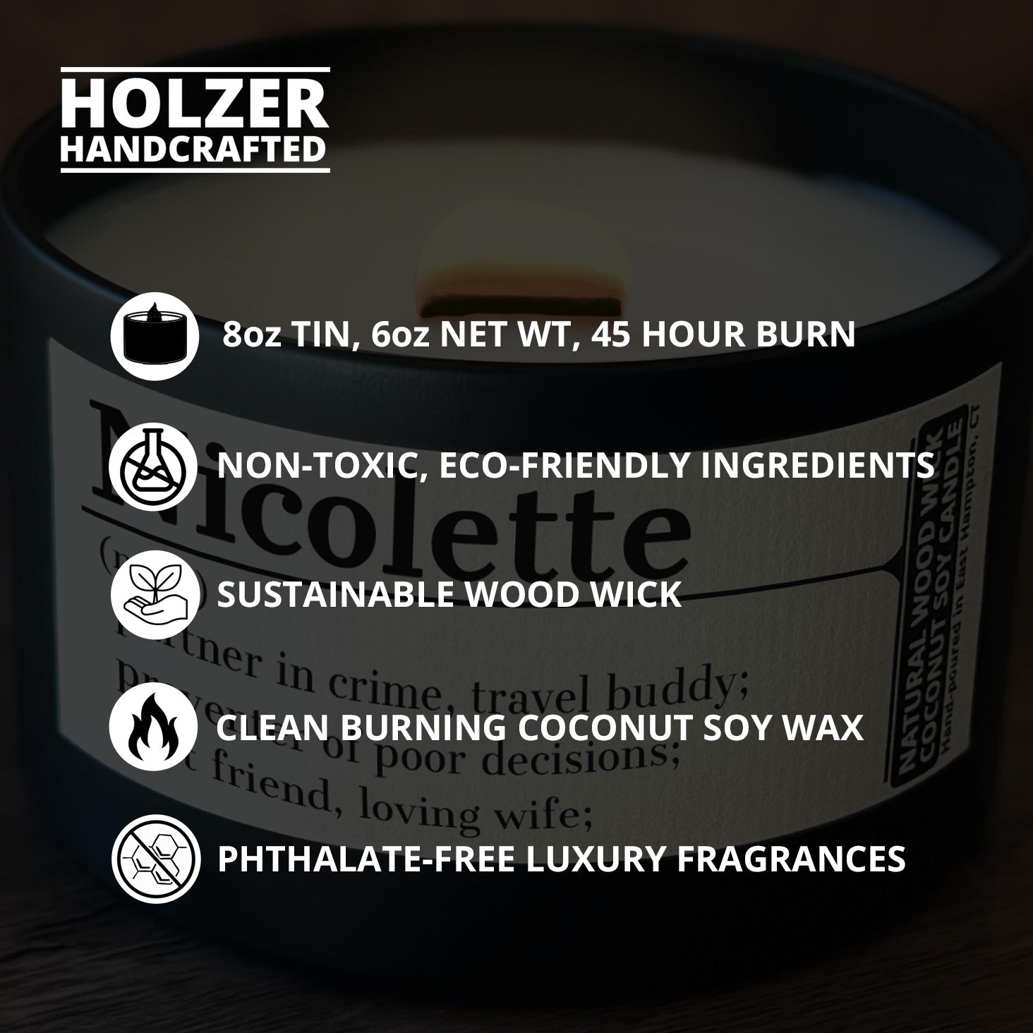 Each Holzer Handcrafted wood wick candle is created with purpose — designed to be as beautiful to give as it is to enjoy. Every 6oz candle is hand-poured in small batches using our coconut soy wax, chosen for its smooth creamy texture, clean burn, and sustainable sourcing.