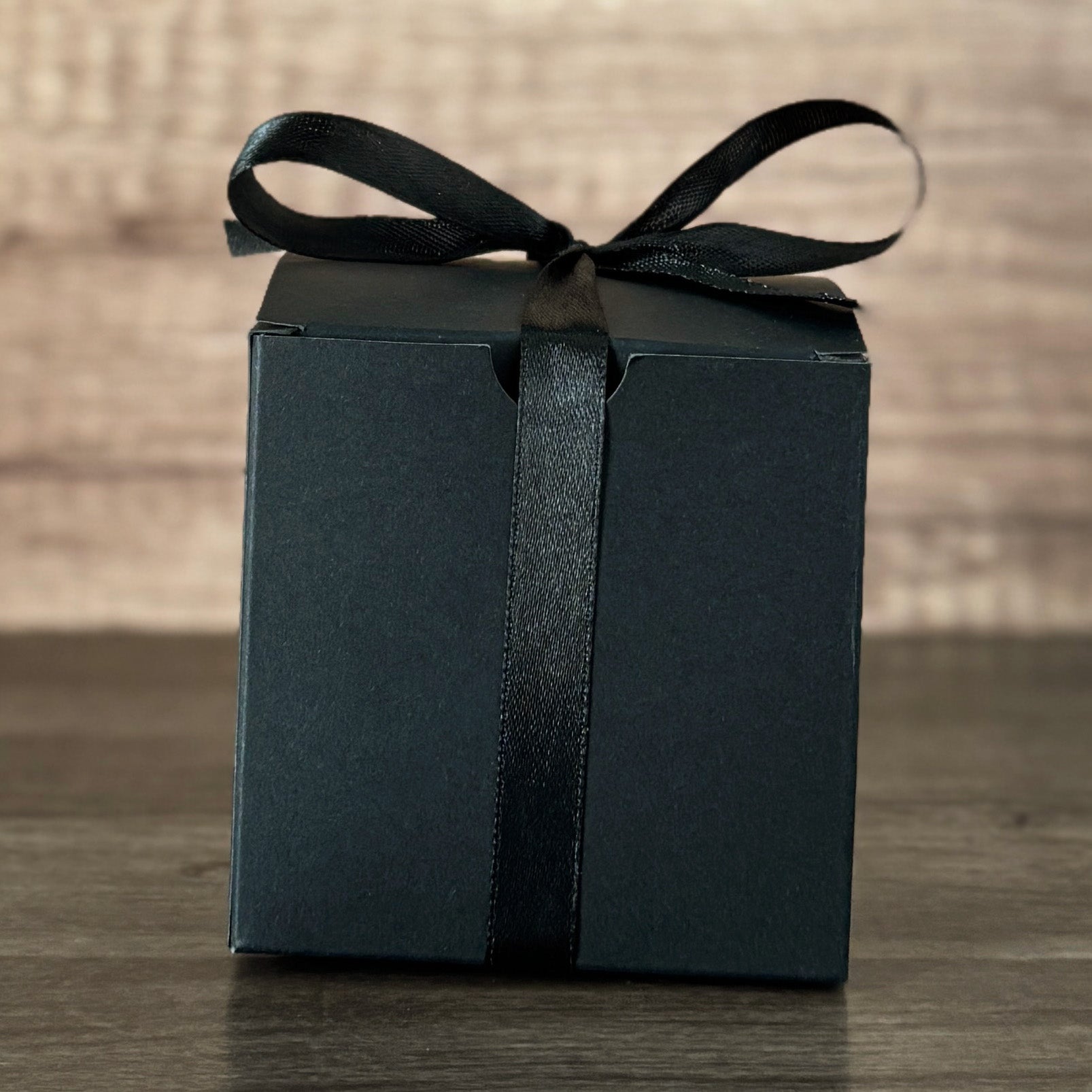 Turn your personalized candle into a ready-to-give moment. Choose between our Black Gift Box, finished with a satin black ribbon, or our Deluxe Paper Mâché Gift Box, a sturdy keepsake-style option tied with the same elegant ribbon.