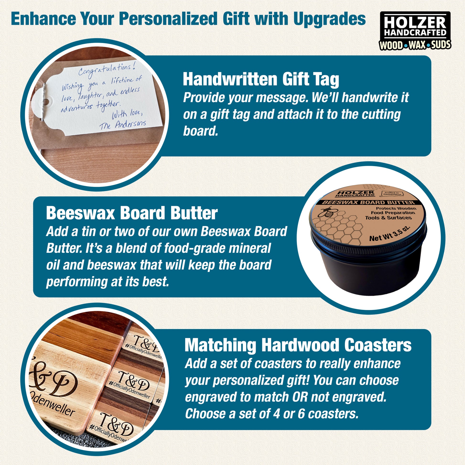I needed my company logo on the large cutting board in addition to the name you could customize, so I contacted Rob and Nicolette asking if that was something they could do. They got back to me very quickly and were extremely helpful. I was able to add the logo for my company, the name of my customer, and choose the styles and fonts I liked. My order was ready within a few days of my first contact. I will absolutely be ordering more from their company. (Probably some candles and soap for myself too.)