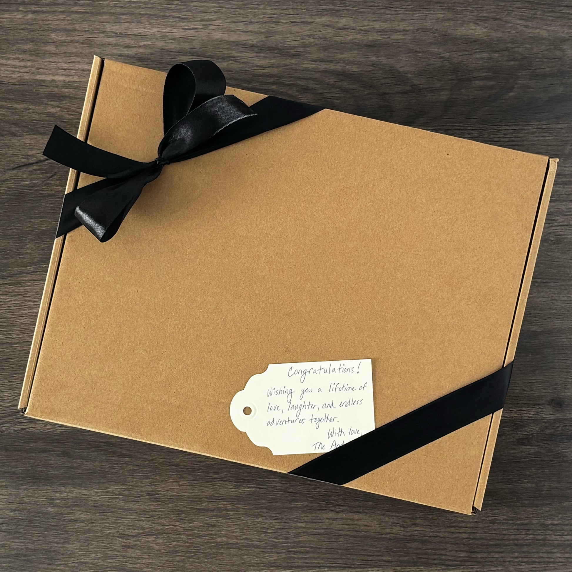 Turn your personalized cutting board into a ready-to-give moment, with a gift box and a handwritten gift tag, finished with a satin black ribbon.